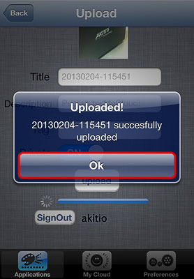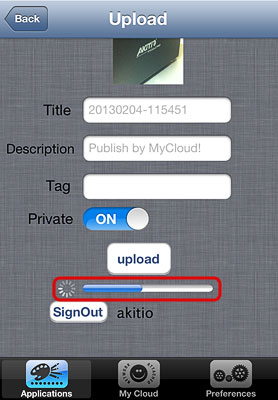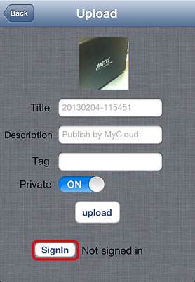 | Video to MyCloud/Youtube | Upload videos from your album on the mobile device to your NAS and simultaneously post them on YouTube. | Click on Video to MyCloud/Youtube, locate the video that you would like to upload, select it and click on Choose to upload the file to your NAS. Follow to upload wizard to sign in to YouTube and post the video clip on your YouTube account at the same time. |