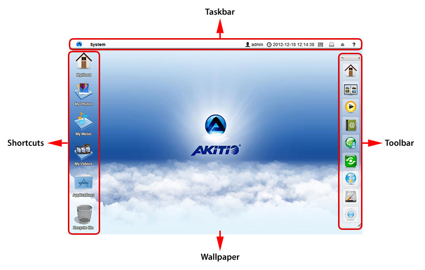 The desktop is the first thing you see after you login through the web interface. It is the place where you can manage and view your files online as well as configure the device settings.