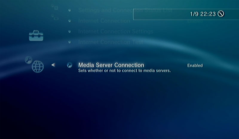 1. On your game console, open the Settings menu, go to Network Settings, select Media Server Connection and Enable it. This will allow the game console to detect the available media servers on your home network.