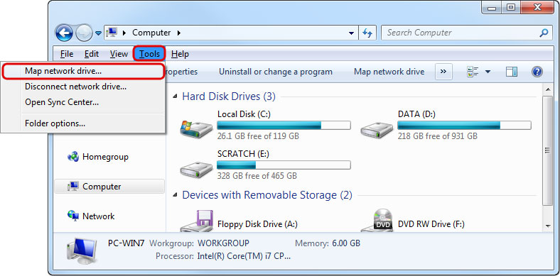 - If you don't see the shortcut, go to Tools in the menu bar and there you can select Map network drive….