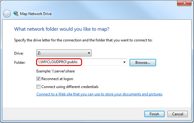 - Enter two backslashes followed by either the host name (e.g. \\MYCLOUDPRO) or the IP address (e.g. \\192.168.1.30) plus a folder (e.g. \\MYCLOUDPRO\public).