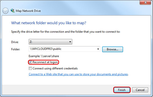 - To create a permanent link that also stays after a system reboot, select Reconnect at logon and then click Finish to complete the setup wizard.