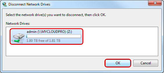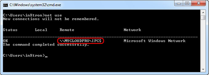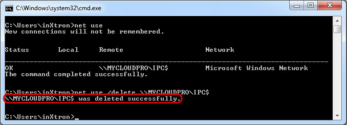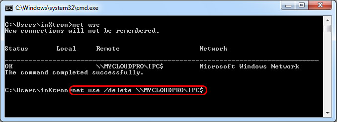 - Type net use /delete \\server\sharename to disconnect the drive. In this example the correct command is net use /delete \\MYCLOUDPRO\IPC$.
