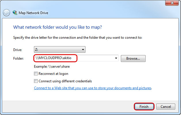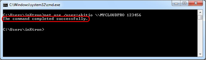 - Still using the command prompt, type net use /user:username \\server\sharename password to create a new connection. In this example, the correct command is net use /user:akitio \\MYCLOUDPRO 123456. You could also connect to a share like this net use /user:akitio \\MYCLOUDPRO\akitio 123456