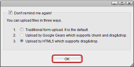 - If this is the first time you are uploading files, you are presented with 3 options. Select your preferred upload method and click OK.