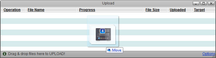Starting with firmware version 20131021, dragging and dropping files also works when the files are dropped directly on the content window, without first opening the upload window.