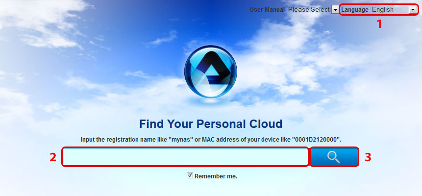 - Select your language (1), enter the name of your home server (2) and click search (3).