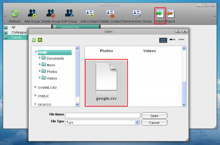 - Open Address Book on the iSharing, select Import, then select google.csv, to complete the Import。