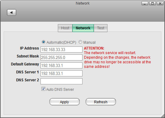 | Automatic (DHCP) | Automatically obtain an IP address for your network drive from the local DHCP server or network router. |