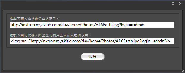 | 連結 | 顯示所選擇項目的URL鏈接及嵌入的HTML程式碼。 |