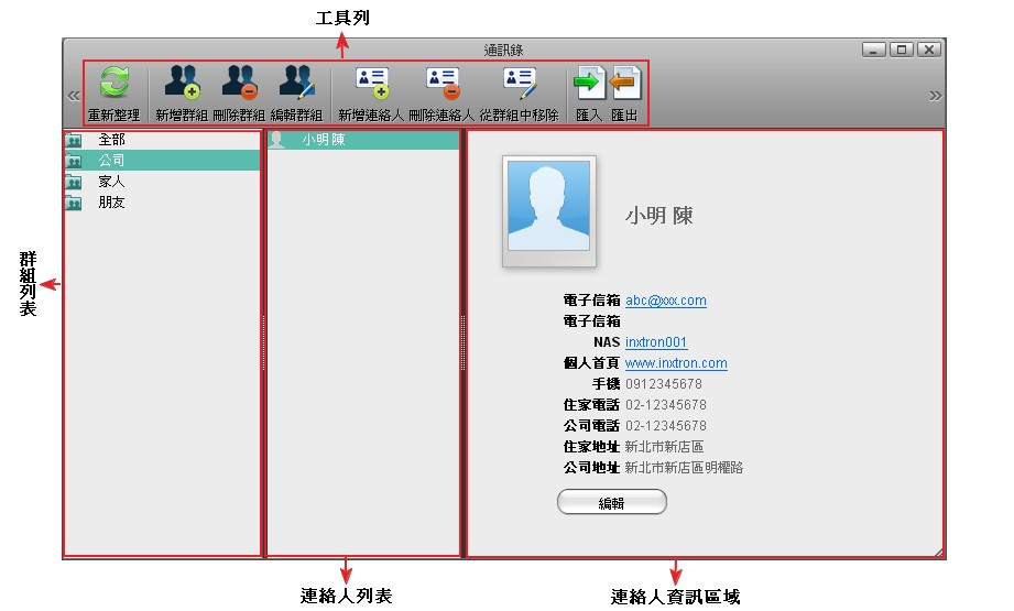 從連絡人列表中選擇一個連絡人,則連絡人的相關資訊將會顯示在連絡人資訊區域中。