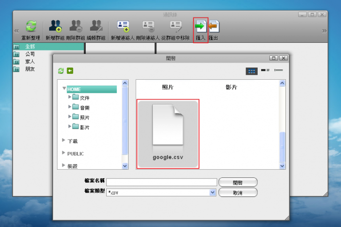 - 在私有雲上打開通訊錄,選擇匯入,再選擇剛才所儲存的google.csv,即完成匯入。