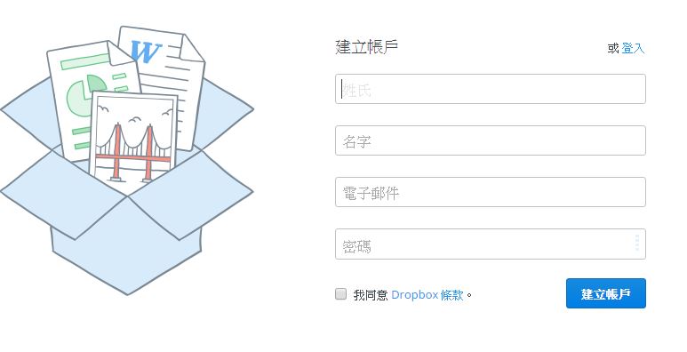 - 如果還未註冊 Dropbox 請先點選 [註冊Dropbox帳戶] 右方的連接。
