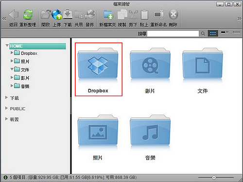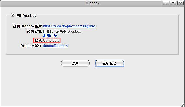 | Dropbox 路徑 | 預設存放位置為 /home/Dropbox/,點擊連結可開啟資料夾。 |