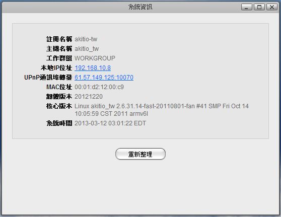 私有雲所有的重要的系統訊息都在這裡,在這裡您可以知道您所使用的私有雲主機名稱、IP位置、UPnP通訊埠轉發(外部點對點連線)是否已啟動、MAC位置、韌體版本……等等。