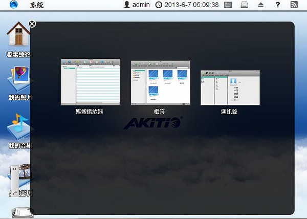 按一下選單列最左邊的系統選單圖示(Akitio的 “A” 標誌)來顯示系統選單。系統選單包含私有雲的基本操作。