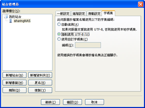 - 字元集請設定為UTF-8來避免無法辨識的編碼。
