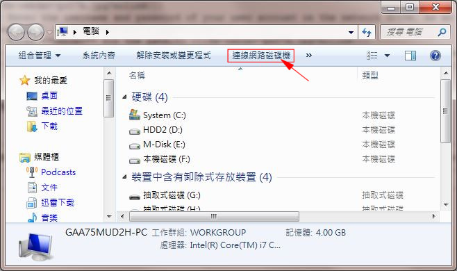 1. 開啟系統「電腦」項目,點選「連線網路磁碟機」,如果沒有在「電腦」視窗上看到「連線網路磁碟機」選項,您可以在「工具」項目中找到它。