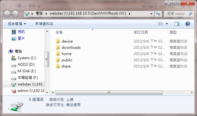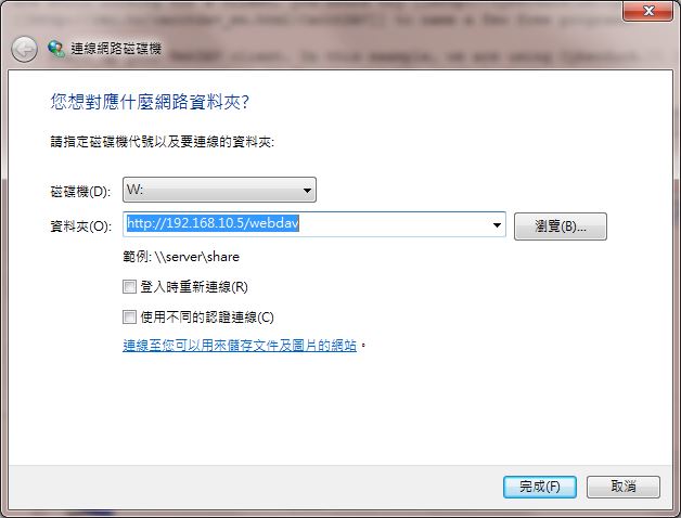 • 在區域網路(LAN)中建立網路磁碟連線,請使用區域網路的IP (例如: http://192.168.10.5/webdav).