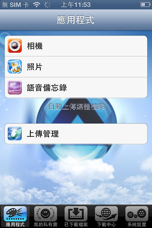 登入成功後,即可進入系統主畫面,下方有五個主要的頁籤:應用程式、我的私有雲、已下載檔案、下載中心、系統設置。