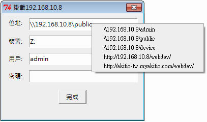 - 按一下位址框右方的空白處來選擇欲掛載的檔案夾位址,預設可以選擇的位址為 admin、public 以及 device。使用者也可以透過Webdav 來掛載私有雲。