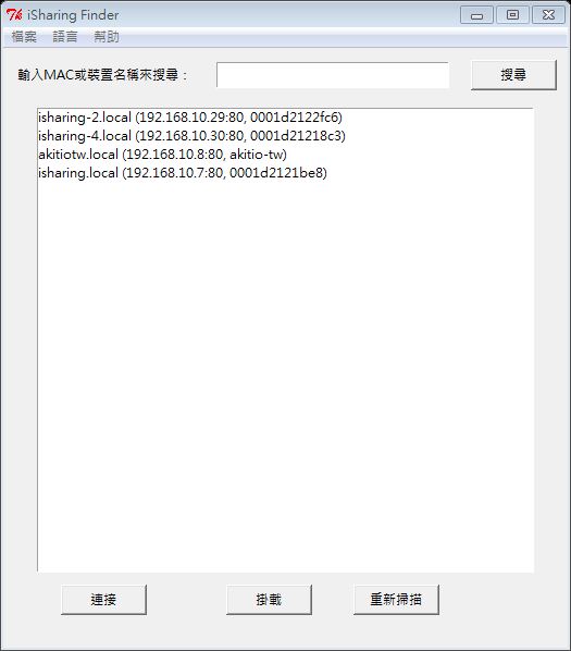 - 開啟iSharing Finder,它將會自動地搜尋私有雲裝置。如果沒有找到,按一下重新掃描按鈕以重新搜尋,或是直接輸入 MAC ID、裝置名稱,並確定你的程式沒有被防火牆給阻擋,再次搜尋私有雲裝置。